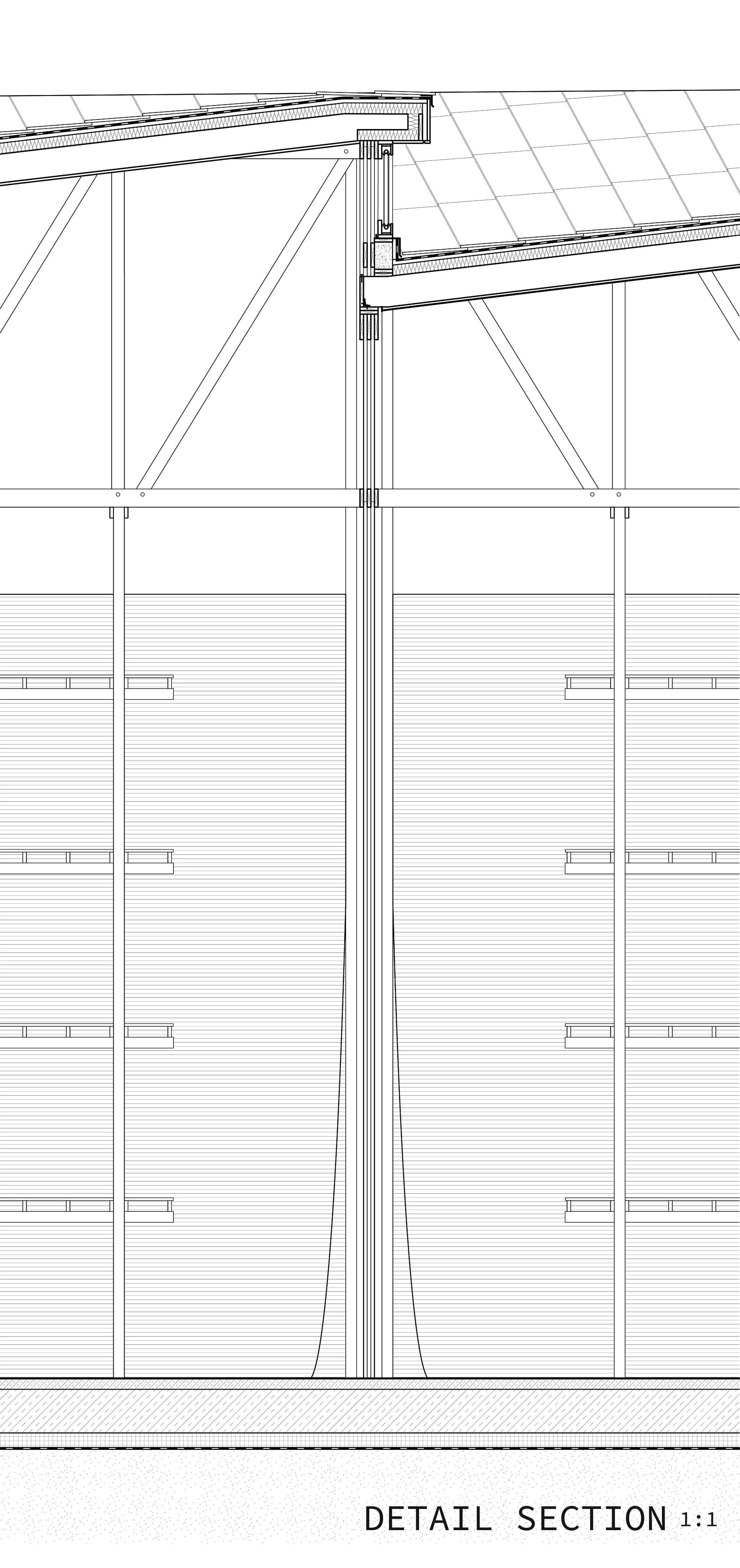 Proposing a radical warehouse prototype for the emergent circular material economy, Warehouse 0 straddles the generic and the site-specific. Creating a sandwiched triple-truss system out of standard-dimensional pine lumber, the frame can support a curved member which cradles the end of an evocative conoid roof. This roof, with its 4-foot overhang, is perfectly oriented to allow solar radiation to permeate the envelope during winter months, while protecting from the harsh summer sun.